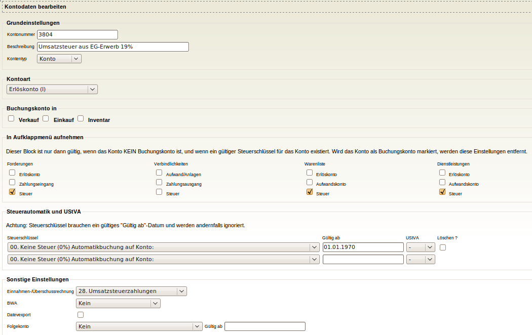 Die Umsatzsteuerumstellung auf 19% für SKR04 für die Steuerschlüssel "EU ohne USt-ID Nummer" ist erst 2010 erfolgt. kivitendo beinhaltet ein Upgradeskript, das das Konto 3804 automatisch erstellt und die Steuereinstellungen korrekt einstellt. Hat der Benutzer aber schon selber das Konto 3804 angelegt, oder gab es schon Buchungen im Zeitraum nach dem 01.01.2007 auf das Konto 3803, wird das Upgradeskript vorsichtshalber nicht ausgeführt, da der Benutzer sich vielleicht schon selbst geholfen hat und mit seinen Änderungen zufrieden ist. Die korrekten Einstellungen kann man aber auch per Hand ausführen. Nachfolgend werden die entsprechenden Schritte anhand von Screenshots dargestellt.