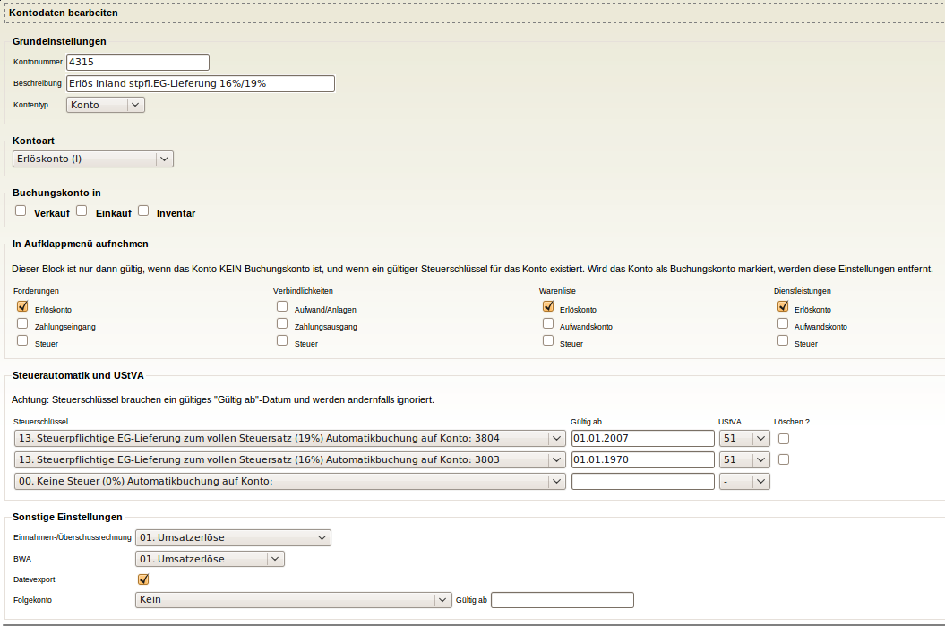 Als Nächstes sind alle Konten anzupassen, die als Steuerautomatikkonto die 3803 haben, sodass sie ab dem 1.1.2007 auch Steuerautomatik auf 3804 bekommen. Dies betrifft in der Standardkonfiguration die Konten 4315 und 4726. Als Beispiel für 4315 müssen Sie dazu unter SystemKontenübersichtKonten anzeigen das Konto 4315 anklicken und die Einstellungen wie im Screenshot gezeigt vornehmen.