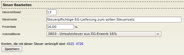 Als Zweites muss Steuergruppe 13 für Konto 3803 angepasst werden. Dazu unter SystemSteuernBearbeiten den Eintrag mit Steuerschlüssel 13 auswählen und ihn wie im folgenden Screenshot angezeigt anpassen.