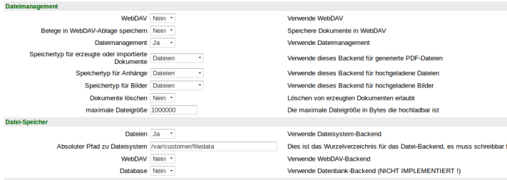 Unter dem Reiter Features im Abschnit Dateimanagement ist neben dem "alten" WebDAV das Dateimangement general zu- und abschaltbar, sowie die Zuordnung der Dateitypen zu Backends. Die Löschbarkeit von Dateien sowie die maximale Uploadgröße sind Backend-unabhängig